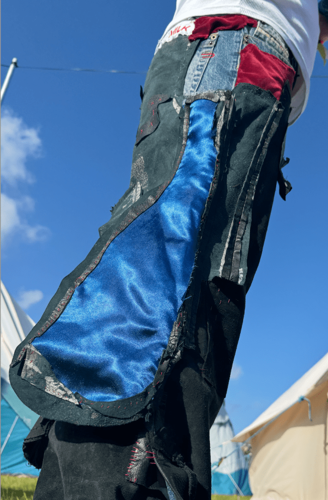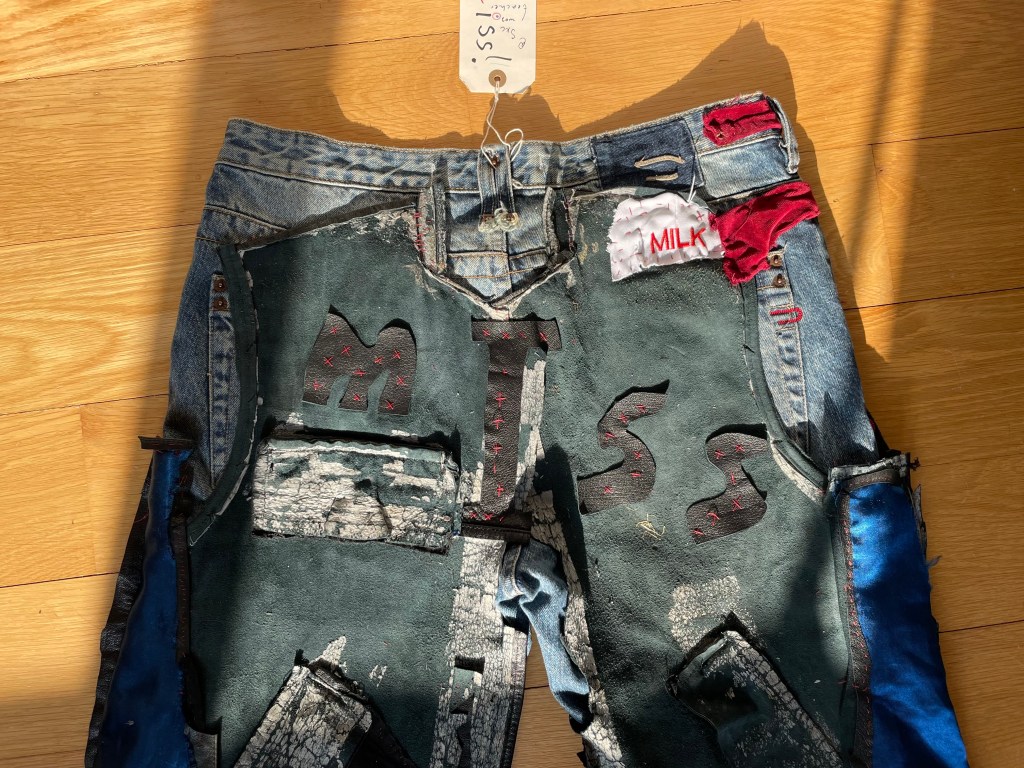 The wide leg trousers are 100% leather, sourced from damaged, secondhand goods. I used collage techniques to layer and hand-stitch strips of leather. I fitted the sides of each leg with silky blue magpie wings for a fluttery movement effect on stage. For a feminine touch, I fitted the waistband with red velvet trim sourced from a dress and stamped the bum with MISS MILK.