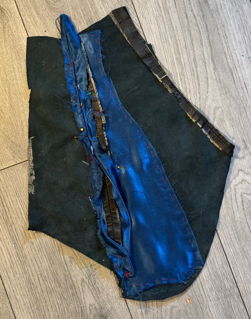 2. Stitch the leather together and to the denim base. Ensure the denim lays flat.